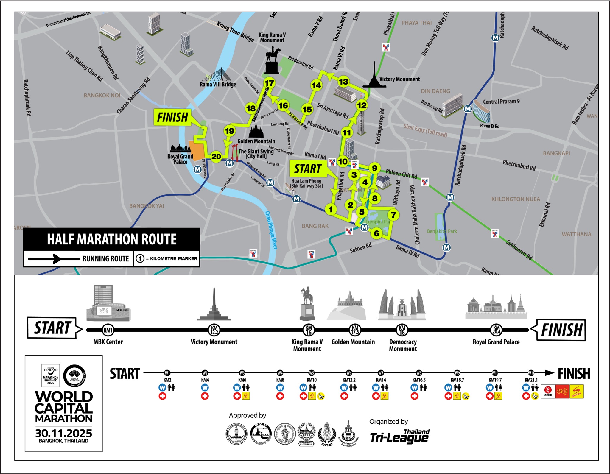 จุดปล่อยตัว: หน้าเอ็มบีเค เซ็นเตอร์ ถนนพญาไท เขตปทุมวัน (42.195 กม. / 21.1 กม.) – ท้องสนามหลวง ถนนราชดำเนินใน เขตพระนคร