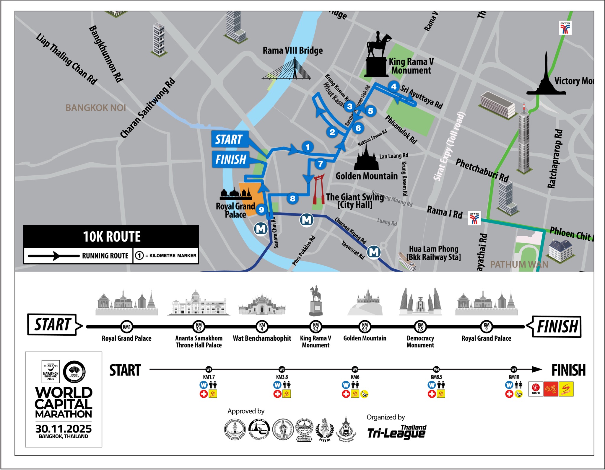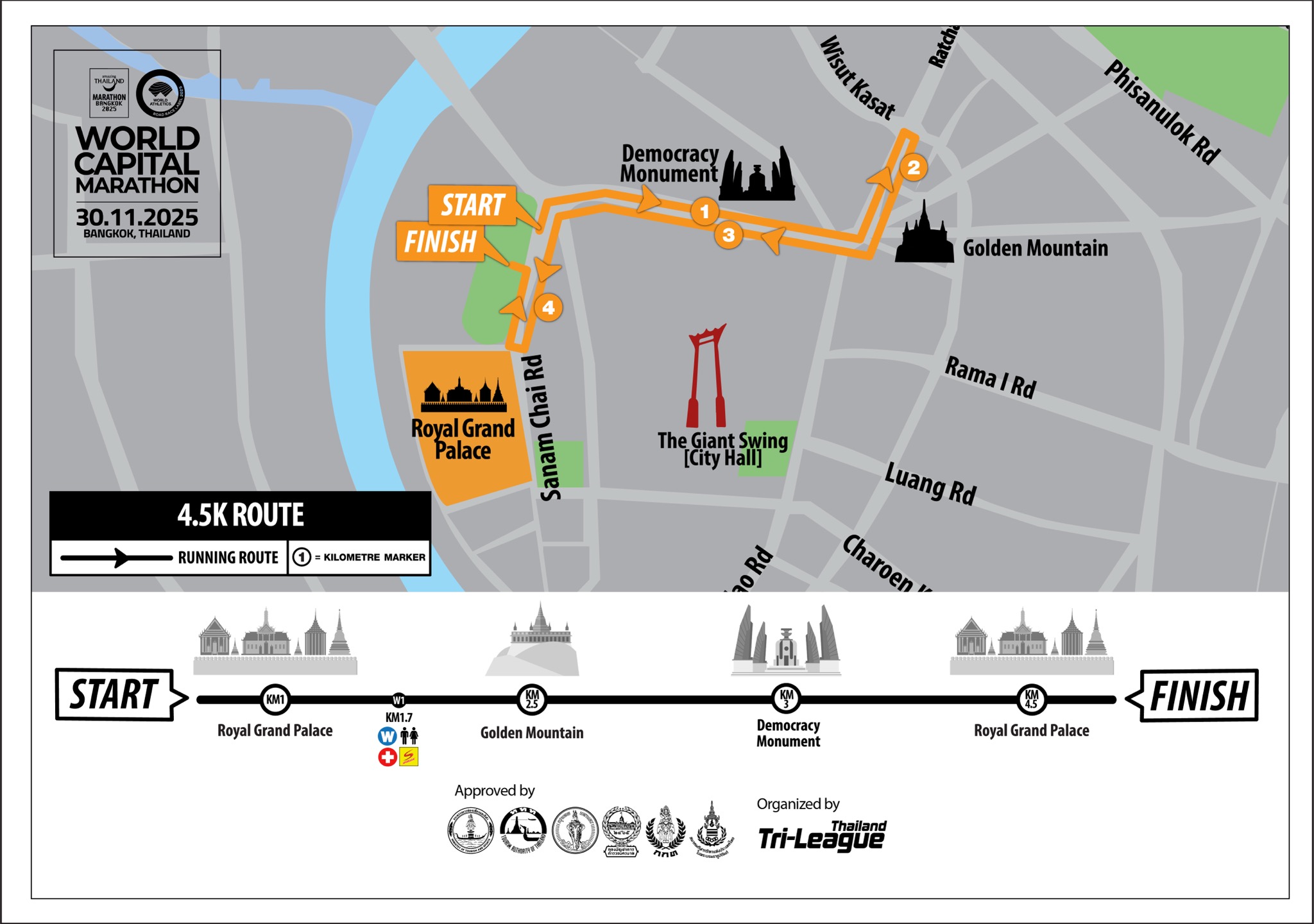 จุดปล่อยตัวระยะ 10K และ 4.5K และเส้นชัยของทุกระยะอยู่ ณ ท้องสนามหลวง เขตพระนคร
