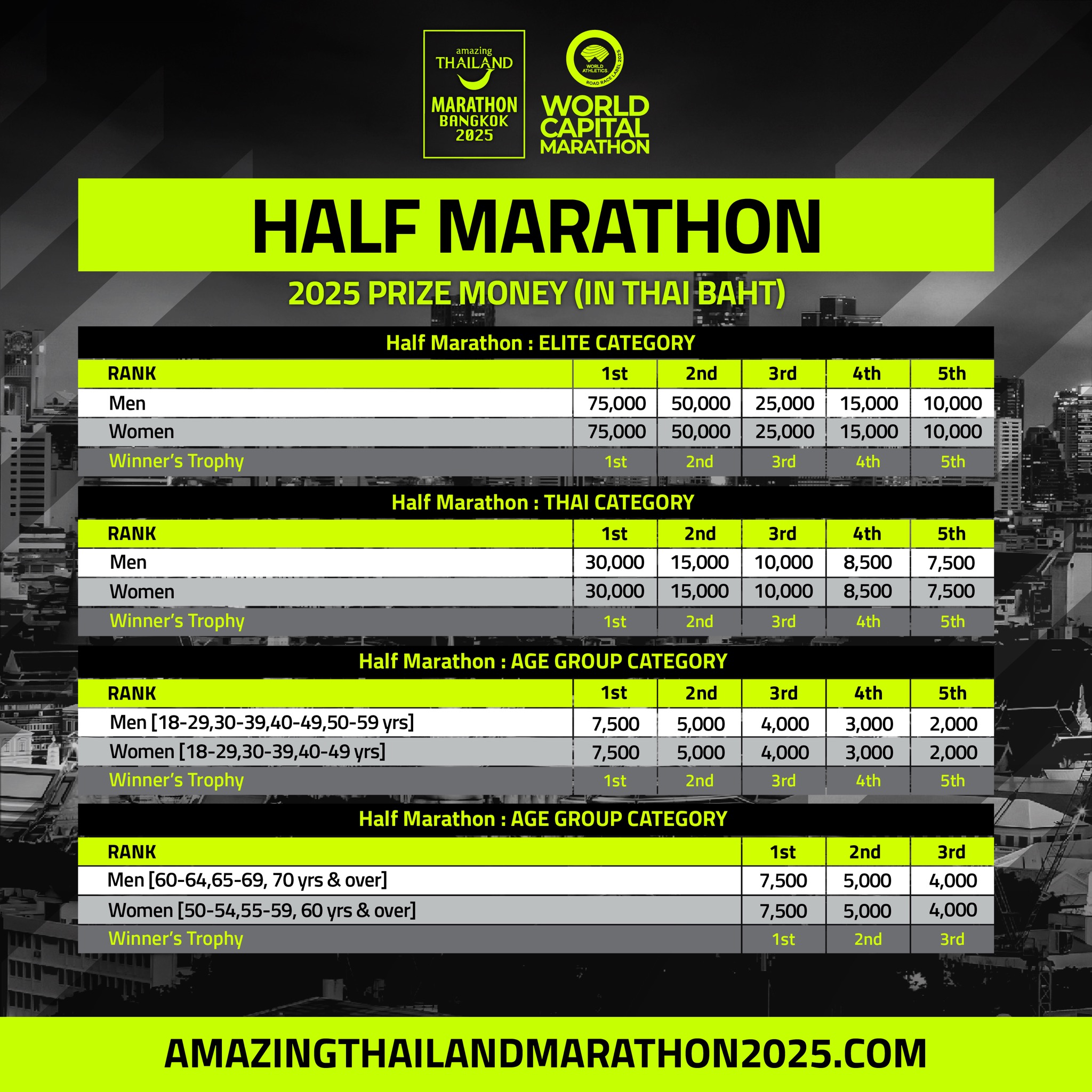 **ผู้แข่งขันในประเภทระยะฮาล์ฟมาราธอนที่ได้รับเงินรางวัลในรุ่นทั่วไป หรือ รุ่นทั่วไปชาวไทยแล้ว จะไม่มีสิทธิ์รับเงินรางวัลและถ้วยรางวัลเกียรติยศ ในรุ่นกลุ่มอายุได้อีก โดยอันดับผู้ชนะในกลุ่มอายุจะถูกเลื่อนขึ้นมาแทนโดยอัตโนมัติ