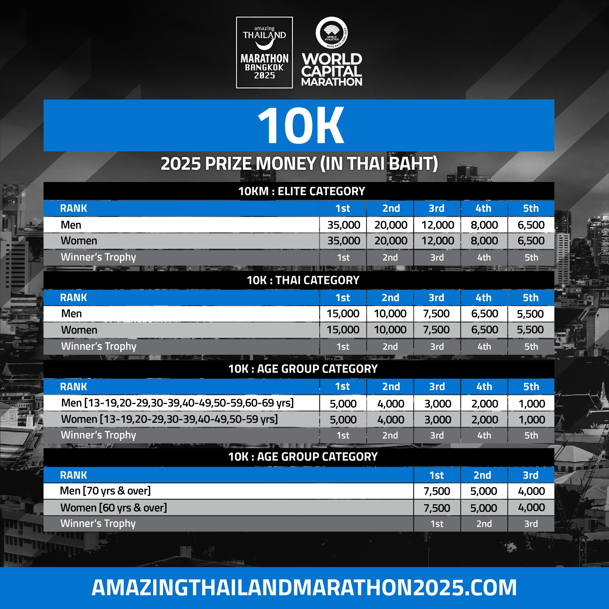 ***ผู้แข่งขันในประเภทระยะ 10 กม. ที่ได้รับเงินรางวัลในรุ่นทั่วไป หรือ รุ่นทั่วไปชาวไทยแล้ว จะไม่มีสิทธิ์รับเงินรางวัลและถ้วยรางวัลเกียรติยศ ในรุ่นกลุ่มอายุได้อีก โดยอันดับผู้ชนะในกลุ่มอายุจะถูกเลื่อนขึ้นมาแทนโดยอัตโนมัติ