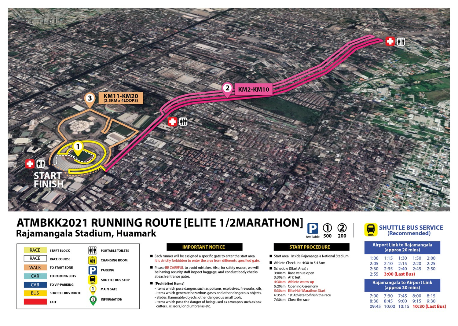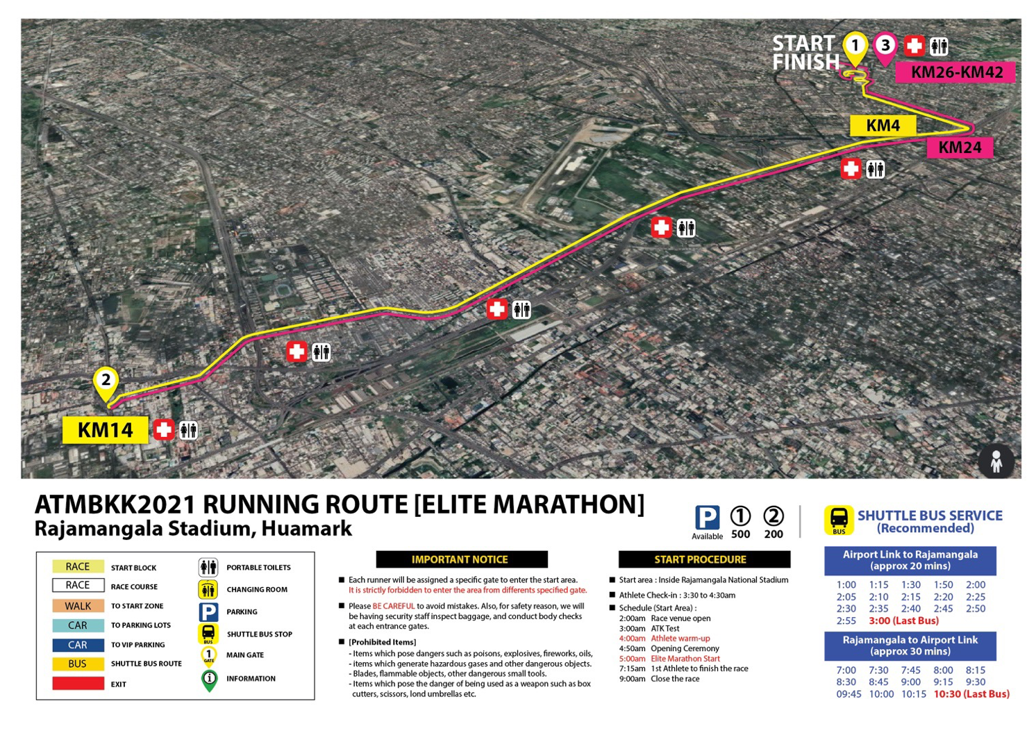 – 42K. and 21K. Free shuttle service from Makkasan Airport Link Station to Rajamangala Stadium from 10.00pm.till midnight(Saturday night)