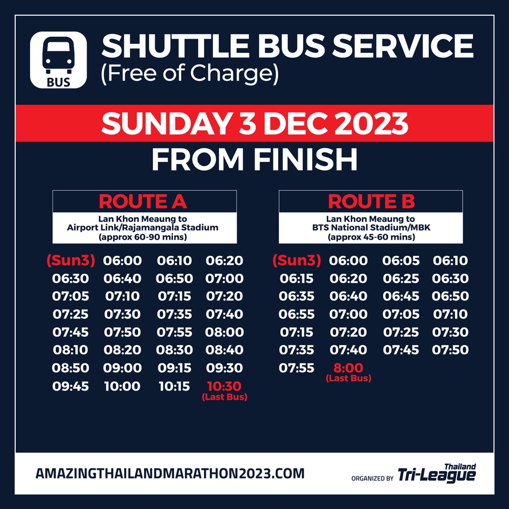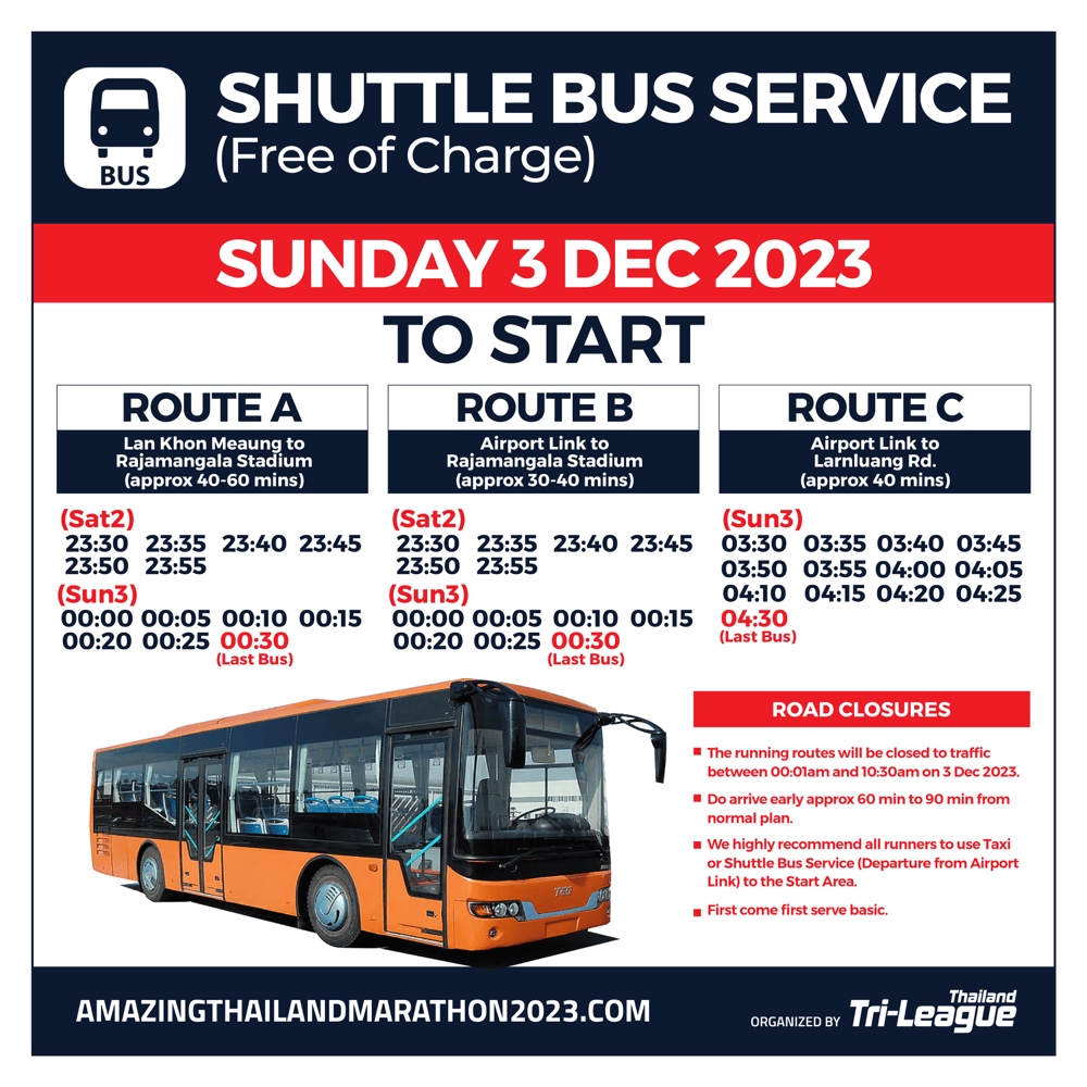 คณะกรรมการฯ ขอแนะนำให้สำรองเวลาของการเดินทางล่วงหน้าอย่างน้อย 75-90 นาที (เนื่องจากการจราจรในวันแข่งขันอาจมีความหนาแน่นกว่าปกติ เนื่องจากการปิดการจราจรในเส้นทางแข่งขันโดยรวม)