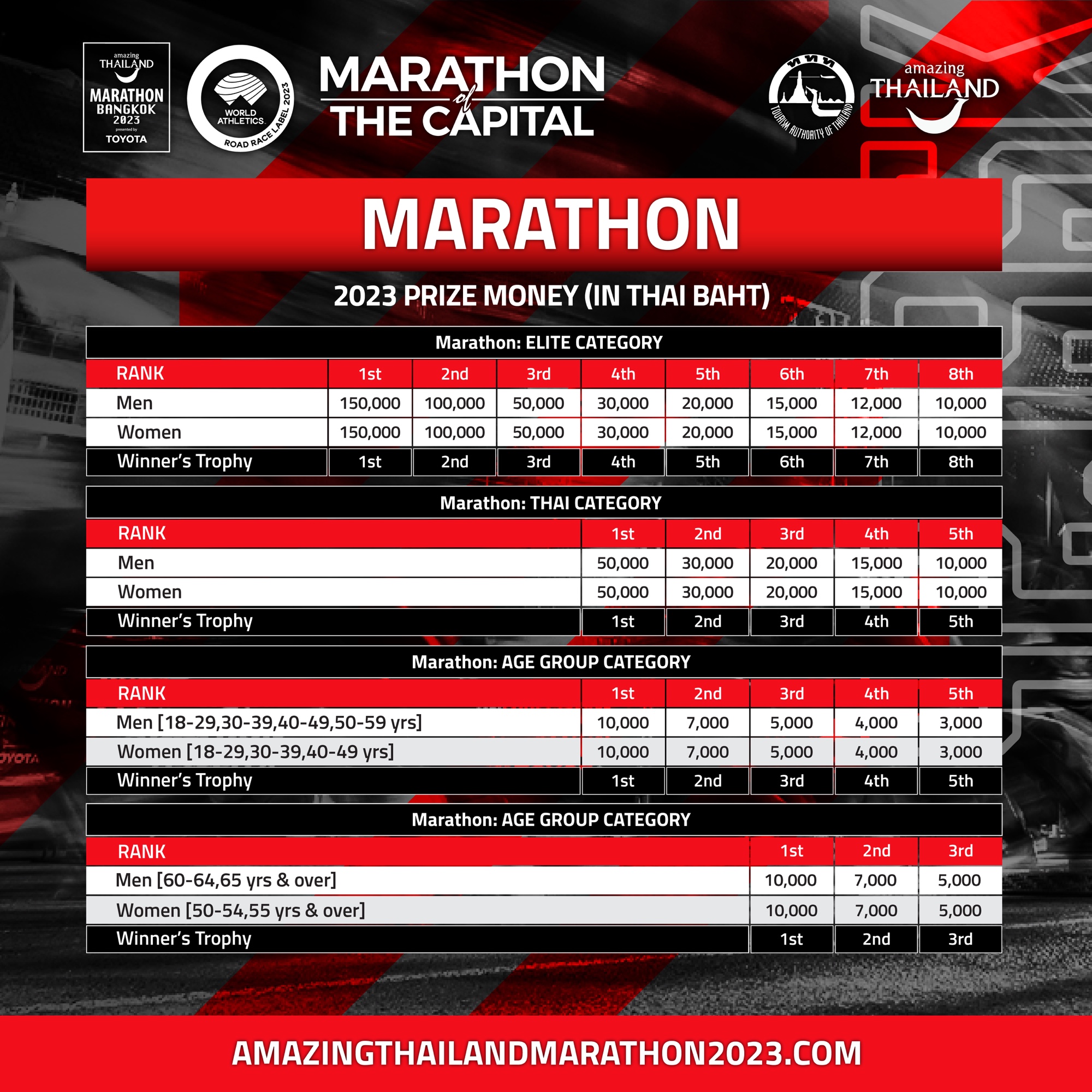 *ผู้แข่งขันในประเภทระยะมาราธอนที่ได้รับเงินรางวัลในรุ่นทั่วไป หรือ รุ่นทั่วไปชาวไทยแล้ว จะไม่มีสิทธิ์รับเงินรางวัลและถ้วยรางวัลเกียรติยศ ในรุ่นกลุ่มอายุได้อีก โดยอันดับผู้ชนะในกลุ่มอายุจะถูกเลื่อนขึ้นมาแทนโดยอัตโนมัติ