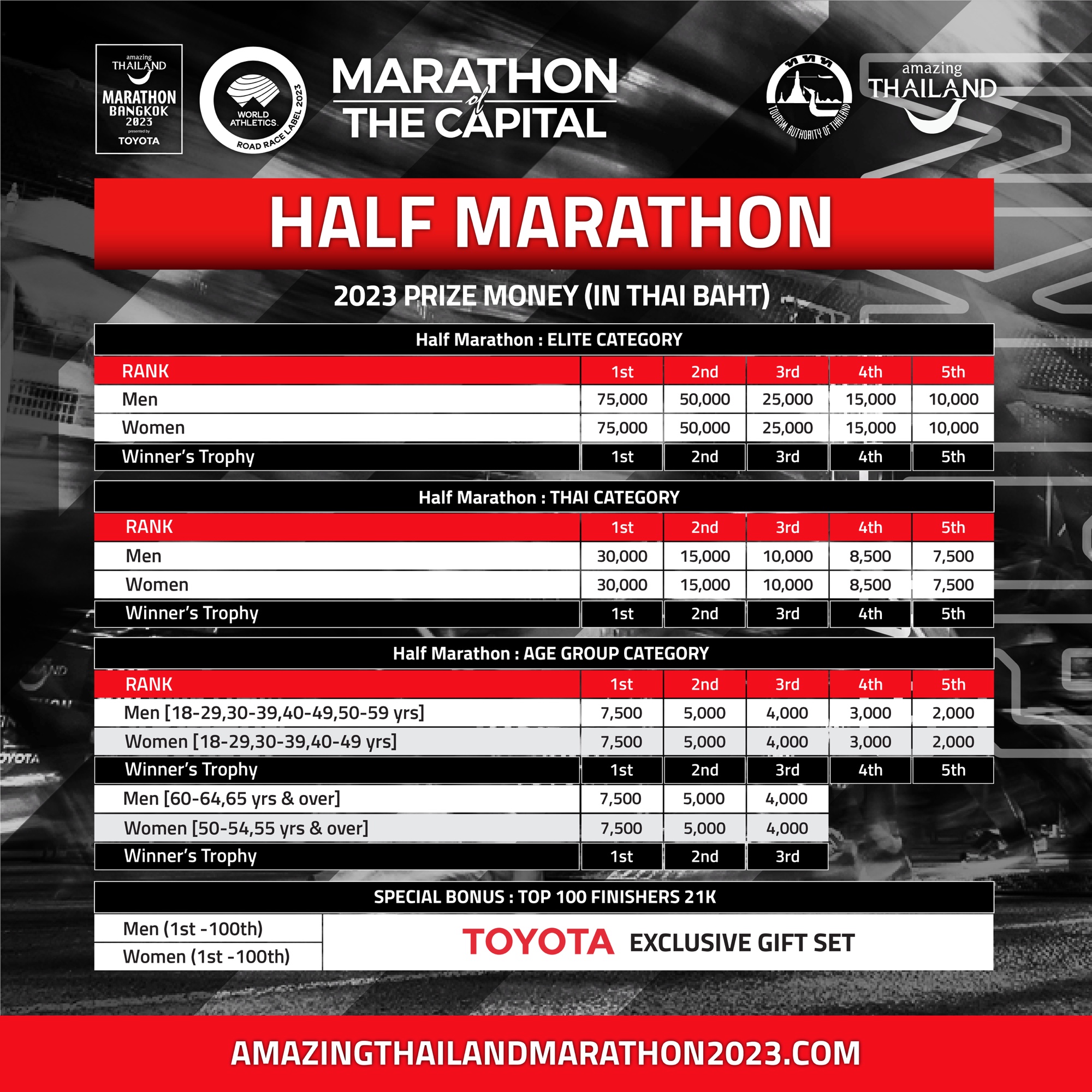 **ผู้แข่งขันในประเภทระยะฮาล์ฟมาราธอนที่ได้รับเงินรางวัลในรุ่นทั่วไป หรือ รุ่นทั่วไปชาวไทยแล้ว จะไม่มีสิทธิ์รับเงินรางวัลและถ้วยรางวัลเกียรติยศ ในรุ่นกลุ่มอายุได้อีก โดยอันดับผู้ชนะในกลุ่มอายุจะถูกเลื่อนขึ้นมาแทนโดยอัตโนมัติ