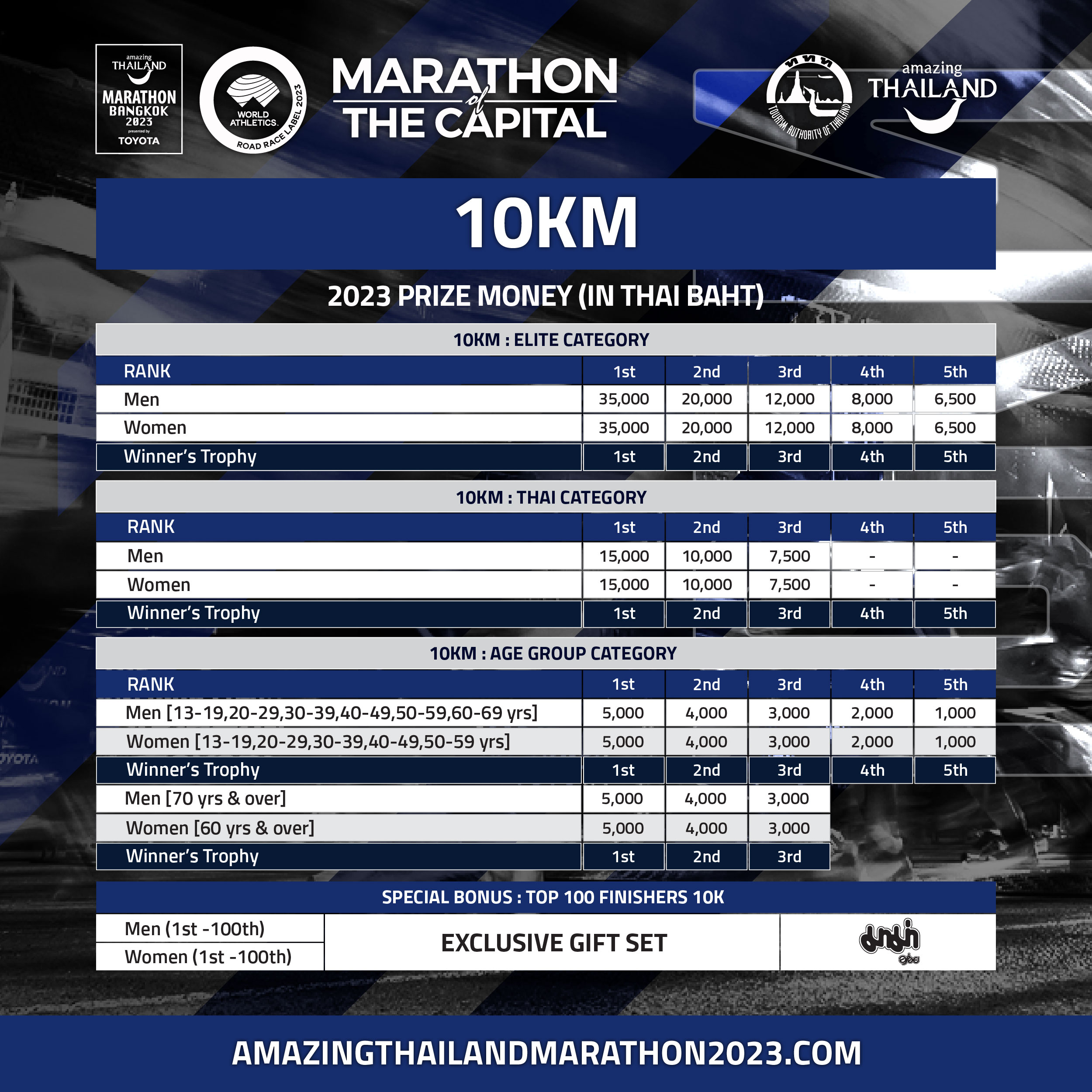 ***ผู้แข่งขันในประเภทระยะ 10 กม. ที่ได้รับเงินรางวัลในรุ่นทั่วไป หรือ รุ่นทั่วไปชาวไทยแล้ว จะไม่มีสิทธิ์รับเงินรางวัลและถ้วยรางวัลเกียรติยศ ในรุ่นกลุ่มอายุได้อีก โดยอันดับผู้ชนะในกลุ่มอายุจะถูกเลื่อนขึ้นมาแทนโดยอัตโนมัติ