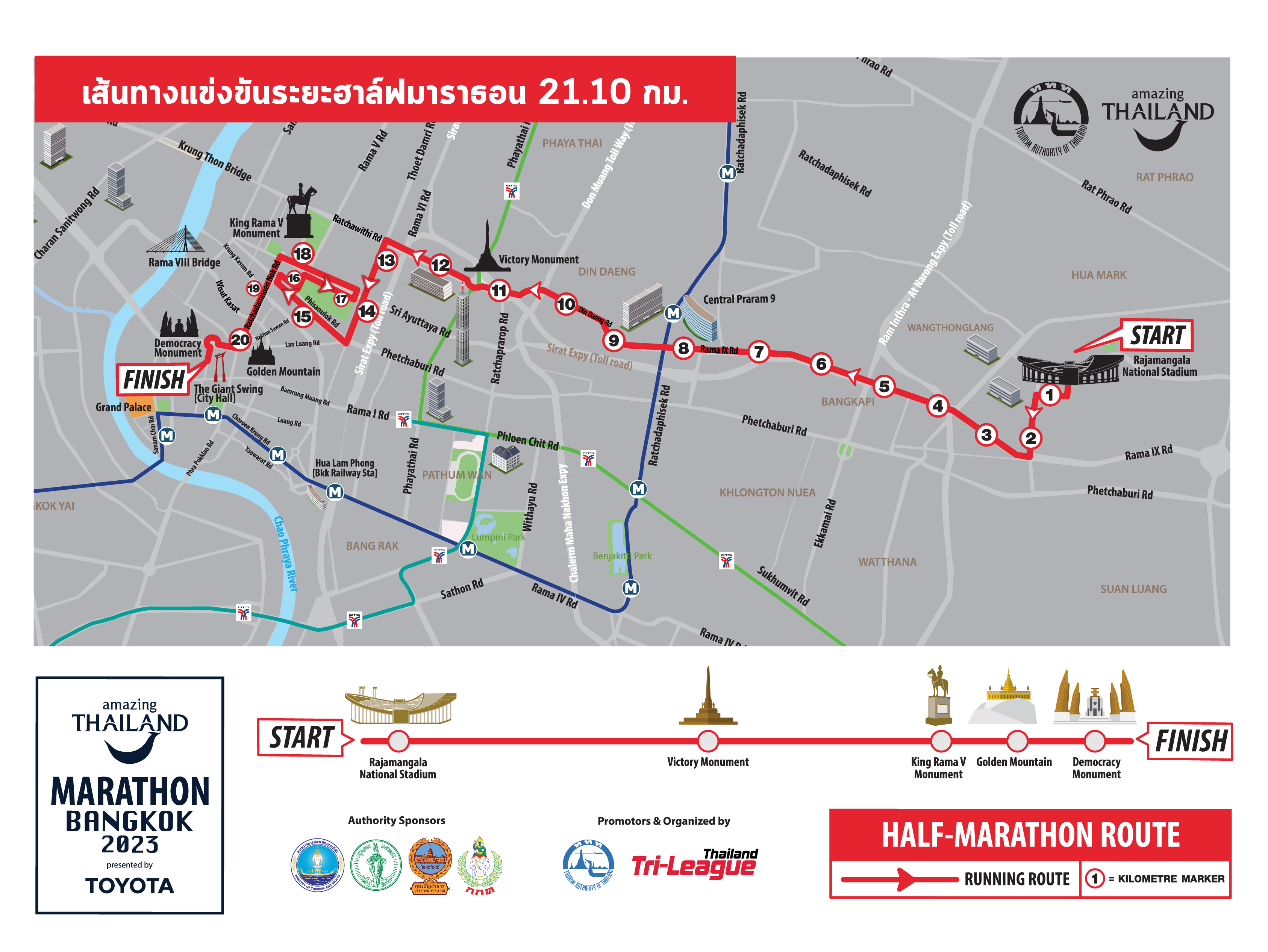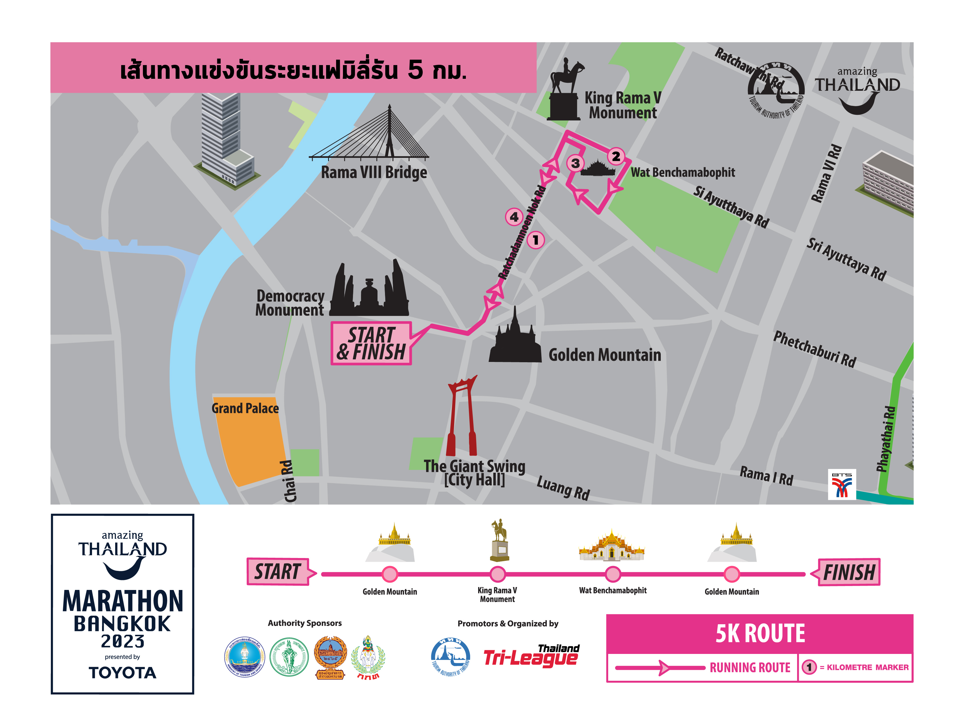 เส้นทางแข่งขันถูกออกแบบให้มีความโดดเด่น โดยทั้ง 4 เส้นทางนักวิ่งทุกท่านจะได้วิ่งผ่าน Landmark สำคัญๆ ของเมืองหลวงของประเทศ อาทิ อนุสาวรีย์ชัยสมรภูมิ พระบรมรูปทรงม้า สะพานพระรามแปด ภูเขาทอง และหลังจากที่ท่านฝ่าฟัน กับบททดสอบของร่างกายของตัวเองในการวิ่งแล้ว ท่านจะได้สัมผัสกับบรรยากาศในการต้อนรับอันแสนอบอุ่น จากน้องๆ อาสาสมัครกองเชียร์ที่คอยต้อนรับทุกท่านในช่วงกม.สุดท้าย บนถนนหลวงของกรุงเทพมหานคร อย่างถนนราชดำเนิน พร้อมกับฉากของเส้นชัยที่หาไม่ได้จากรายการวิ่งที่ไหนของประเทศไทย นั่นคือ ท้องสนามหลวง ท่านจะได้ภาพแห่งความทรงจำที่จะประทับใจ ไม่รู้ลืม