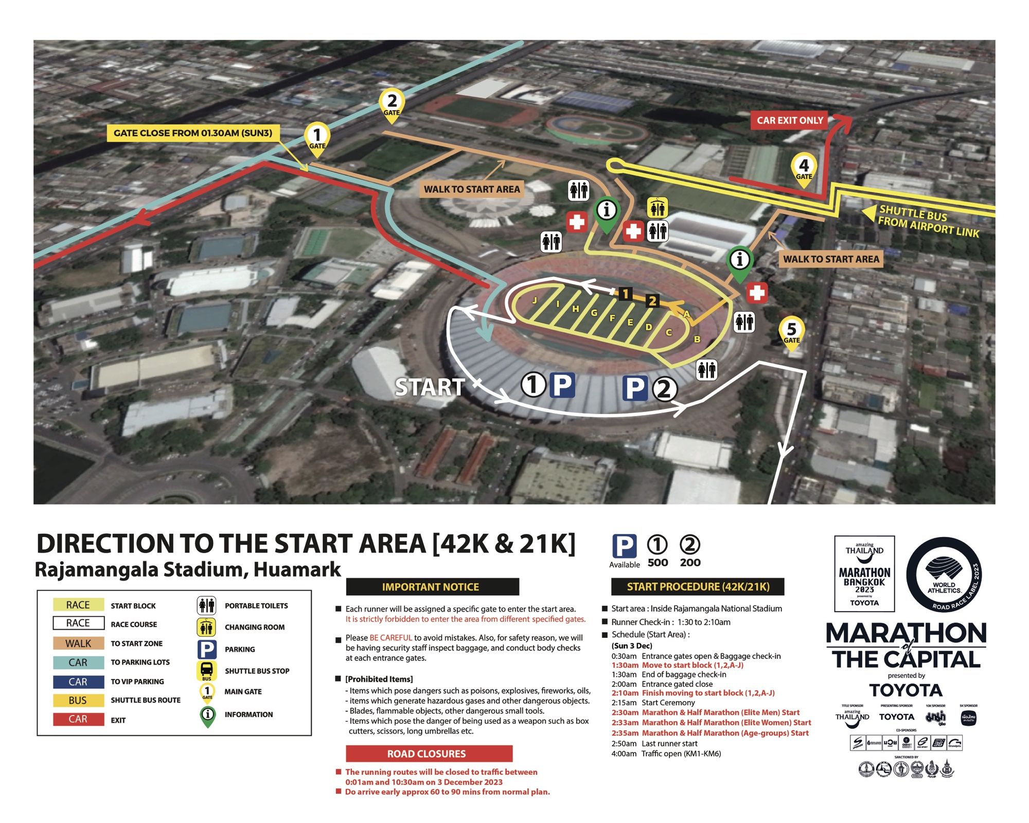 01.00-01.40 น. นักวิ่งระยะมาราธอน ระยะฮาล์ฟมาราธอน รายงานตัว เข้าบล็อกสตาร์ท / Marathon & Half Marathon Check in to Start Block (A-J)