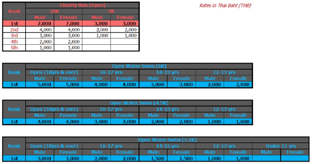All finishers will receive a finisher medals. the trophies will be awarded to the first 5 in 10k and first 3 in 5k category. In addition we will have cash prizes to our top 5 of 10k finishers and top 3 of 5k finishers. The table below shows the price money amount in Thailand Baht (THB).