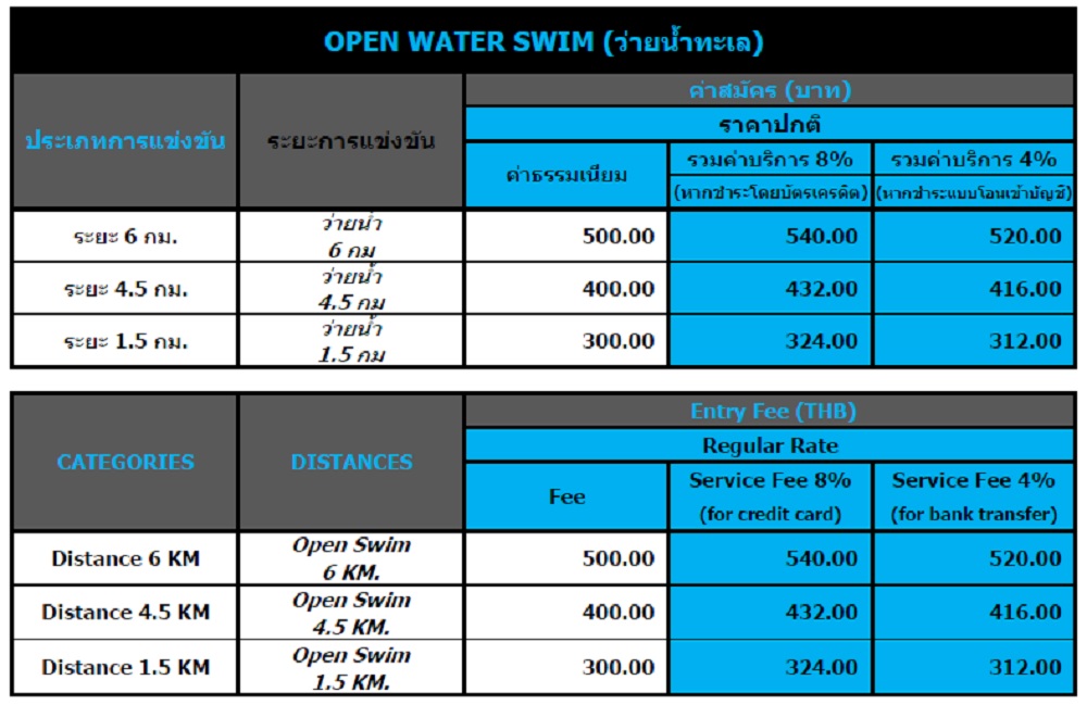ประเภทการแข่งขัน: ว่ายน้ำทะเล (ระยะทาง 6 กม 4.5 กม และ 1.5 กม)