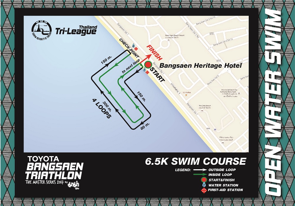 เส้นทางแข่งขันว่ายน้ำ ถูกออกแบบให้มีความท้าทายต่อผู้แข่งขัน และที่สำคัญมีความปลอดภัยสูง โดยนักว่ายน้ำทุกท่านจะต้องว่ายในสระว่ายน้ำในทะเลรูปตัว L (L Shape] ที่ใหญ่ที่สุดในประเทศไทย ทั้งสิ้น 4 รอบๆ ละ 1,500 เมตร โดยในแต่ละรอบทุกท่านจะต้องวิ่งมาผ่านจุดเช็คเวลา Chip Timing บนชายหาด จากนั้นต้องวิ่งลงทะเลเพื่อว่ายน้ำในรอบต่อไป