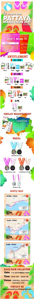 Pattaya Marathon 2017 is an annual international marathon race which is held on the second Sunday of July in the city of dream, Pattaya city, Thailand. It is an international standard Road Race. It has grown significantly since its inaugural race in 1992 – the 2016 event attracted a total of 15,000 entrants for all categories. There are five categories of competition: the full marathon, the half marathon, the 10.55 kilometres run, the 3.7 km wheelchair and the 3.7 km fun run race.