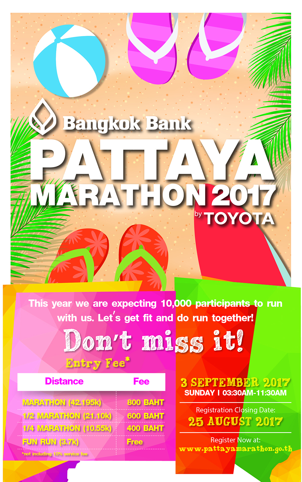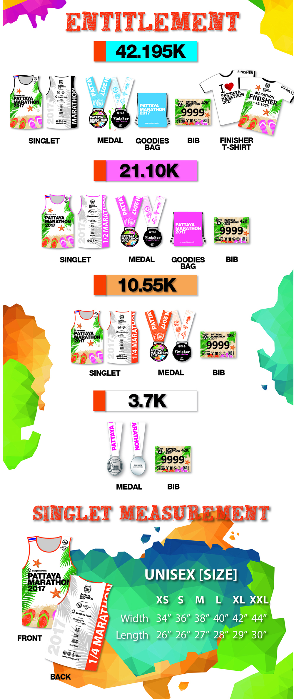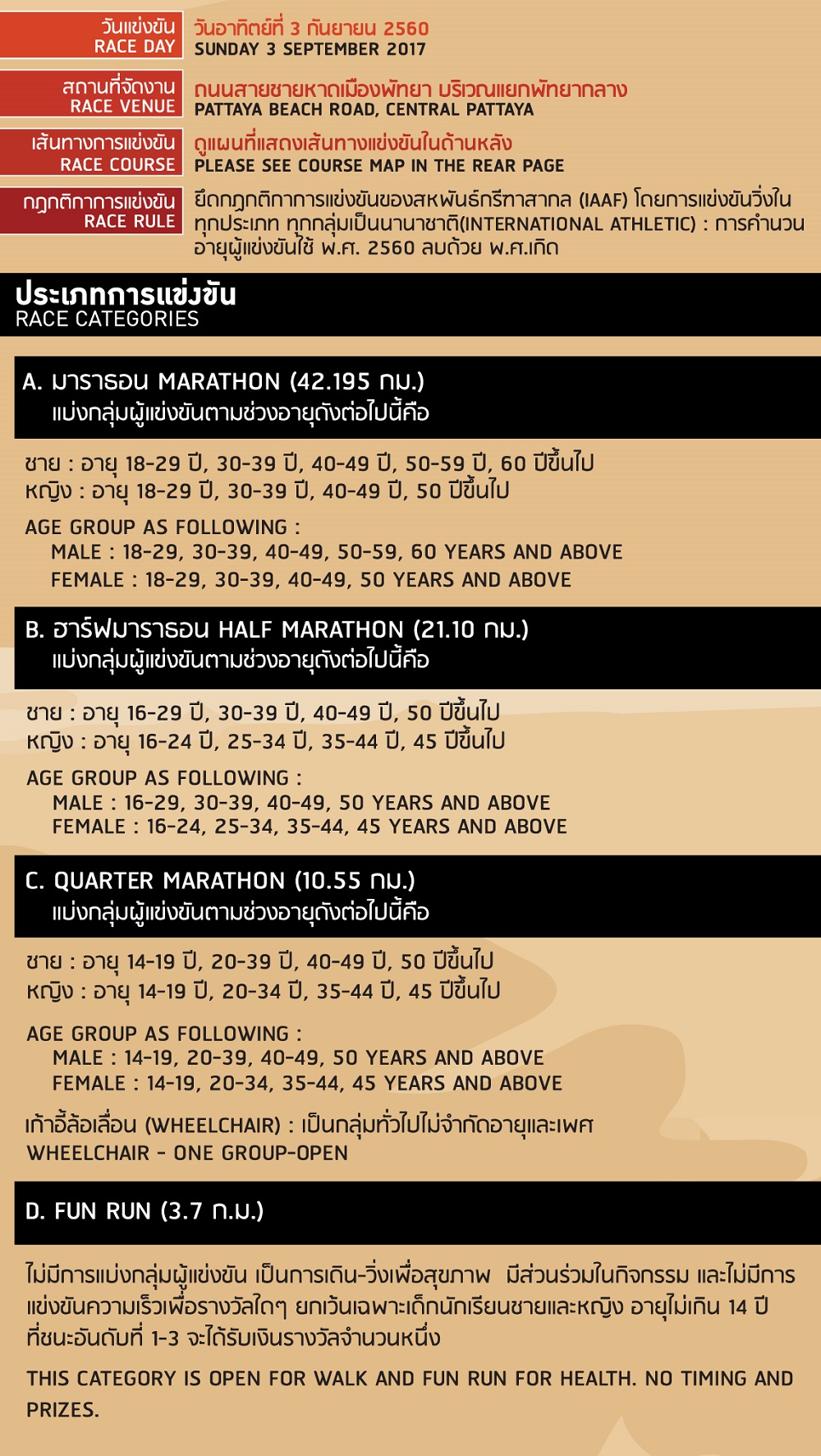 ประเภทการแข่งขัน: วิ่งมาราธอน (ระยะ 42.195 กม., ระยะ 21.10 กม., ระยะ 10.55 กม. และระยะ 3.7 กม.)